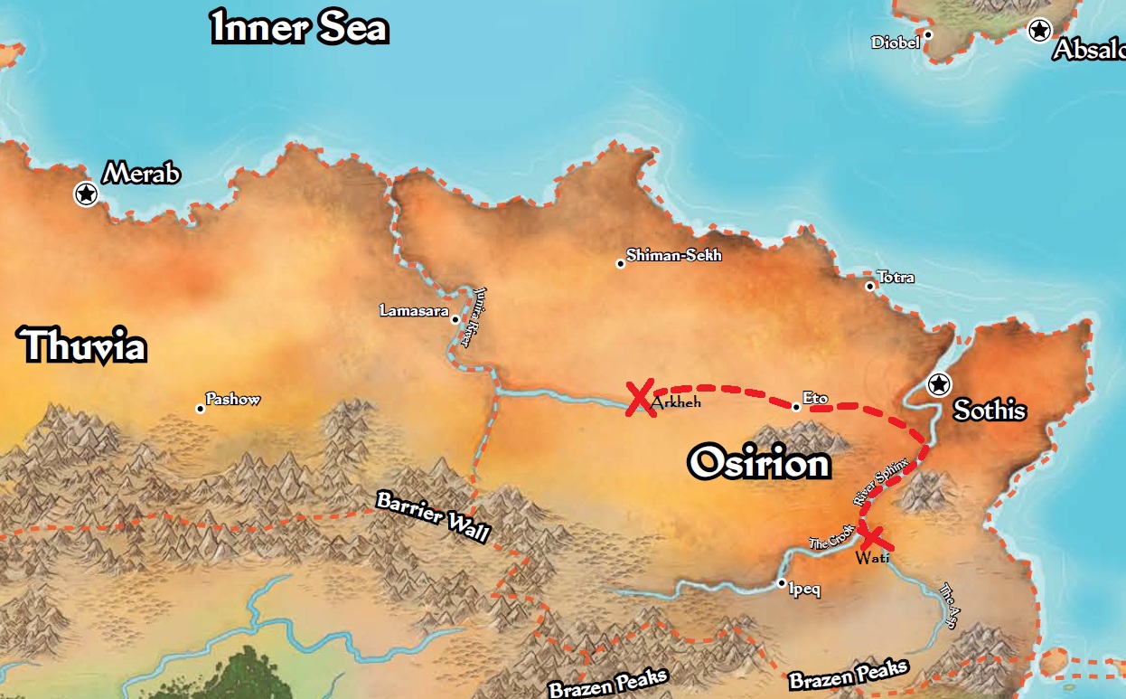 En Osirion, à Wati, un groupe d'aventuriers auto proclamés “Le Marteau du Destin” à participé à l'ouverture de ruines millénaires. Avant d'aller explorer la zone qui leur a été attribuée ils ont été embauchés par un gnome, Gaditor, pour retrouver une mystérieuse figurine de loup. Leur mission accomplie, Gaditor les a embauchés comme escorte pour son voyage de retour vers un lointain pays de l'ouest, à travers une route marchande longue et périlleuse, la Route de L'Or.